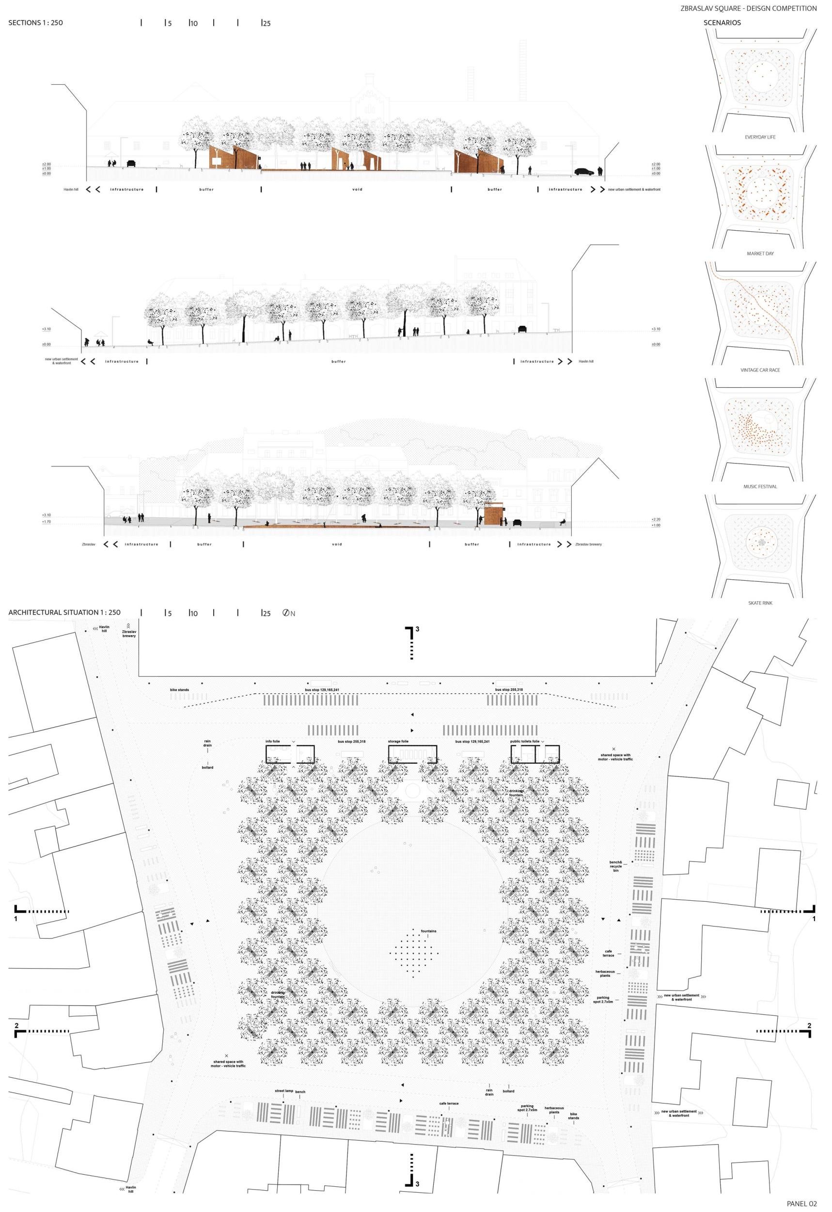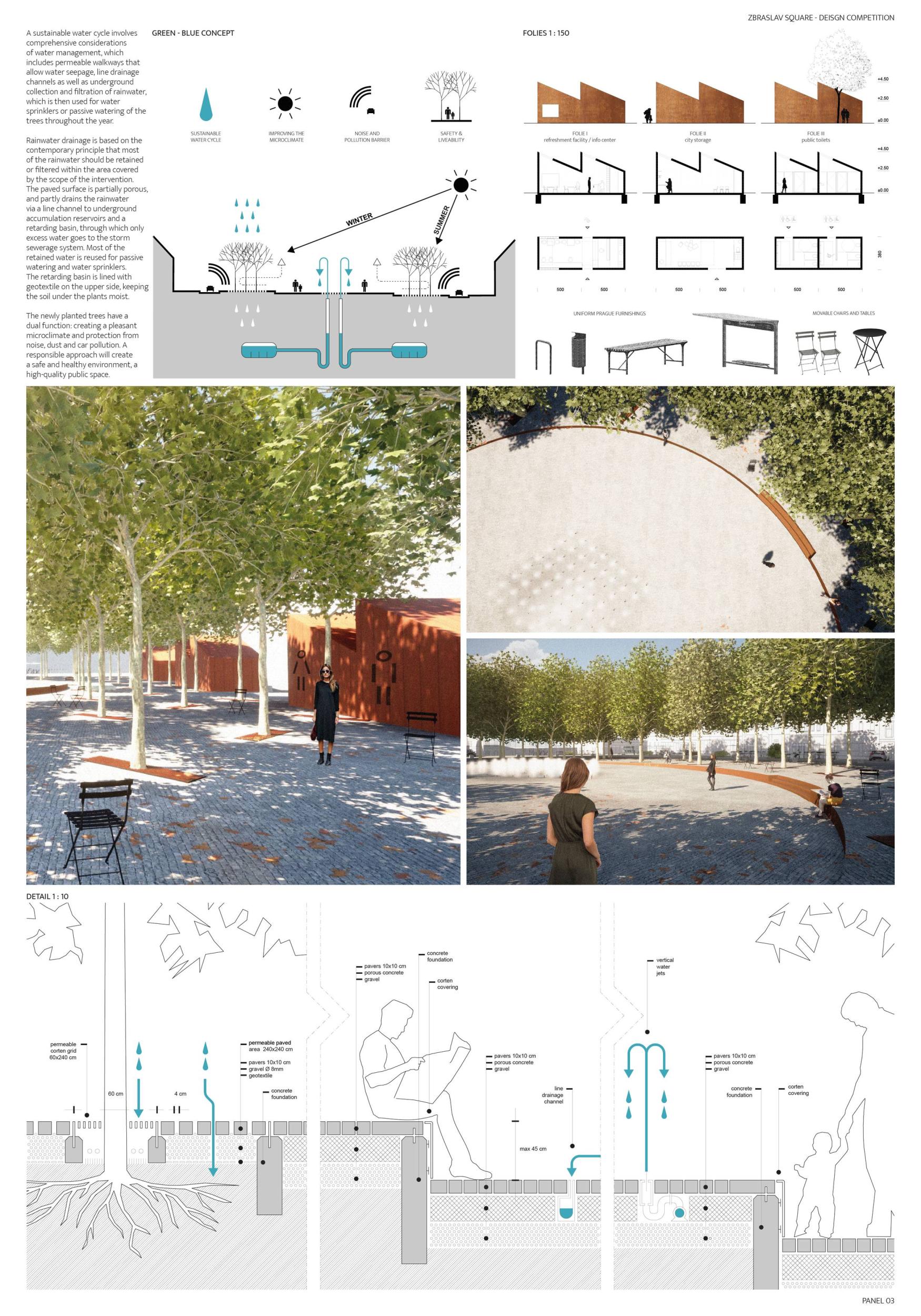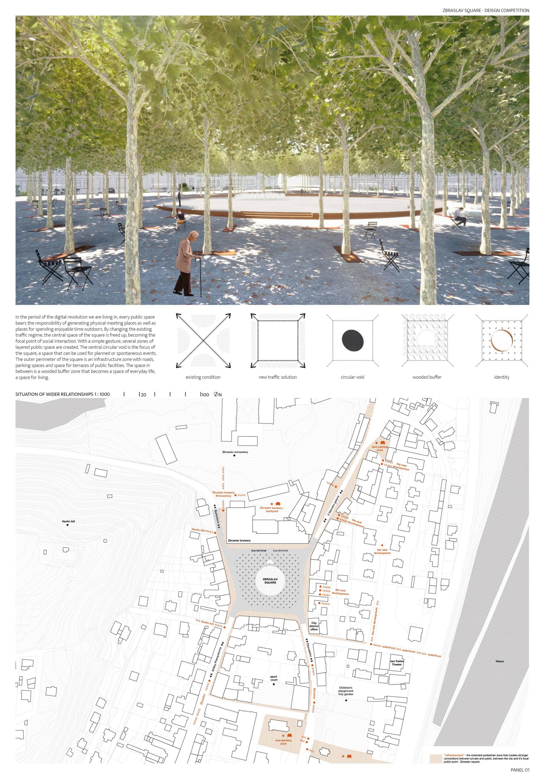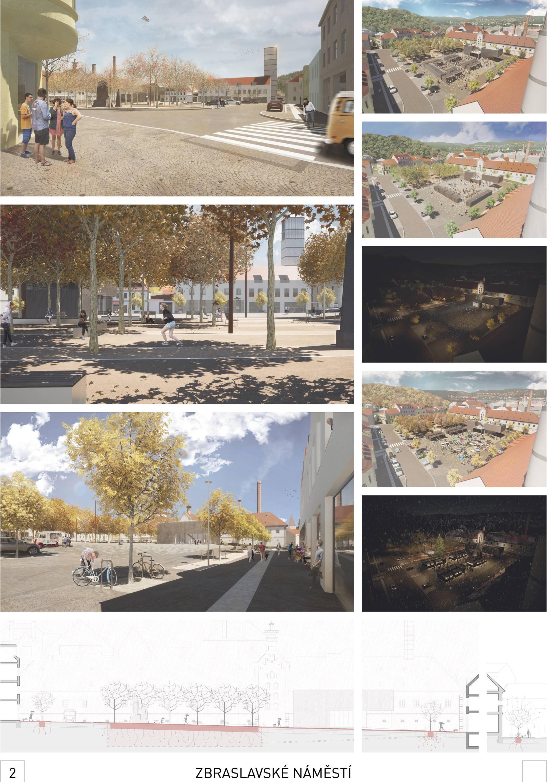 Porota v návrhu oceňuje celkovou vyváženost a čitelnou organizaci prostoru, která umožňuje bohatou nabídku využití. Autoři potvrzují, co je na náměstí neměnné, odklání průjezdnou dopravu od východní strany, propojují ji s hlavní plochou a dávají tak příležitost jejímu rozvoji. Zároveň vhodně nastavují velikost náměstí, pomocí zeleně pracují s měřítkem a proporcí a dle názoru poroty dosahují harmonického dojmu: polovina náměstí pro „pobyt v přírodě“, polovina pro „pobyt ve městě“ nabízí dvojí obytnost. Otevřenější a uzavřenější prostory se vzájemně doplňují a koexistují v dobrém vztahu. Z krajinářského hlediska má návrh jasnou, silnou strukturu, která podporuje charakter náměstí pro jakékoli využití, ať už v běžném denním provozu nebo pro akce s programem. Porota také chválí pietní integraci pomníku do zeleně bez zbytečného patosu. Návrh je ve svém schématu dostatečně flexibilní a jeho další úpravy v rámci dopracování studie nepoškodí autorský koncept.